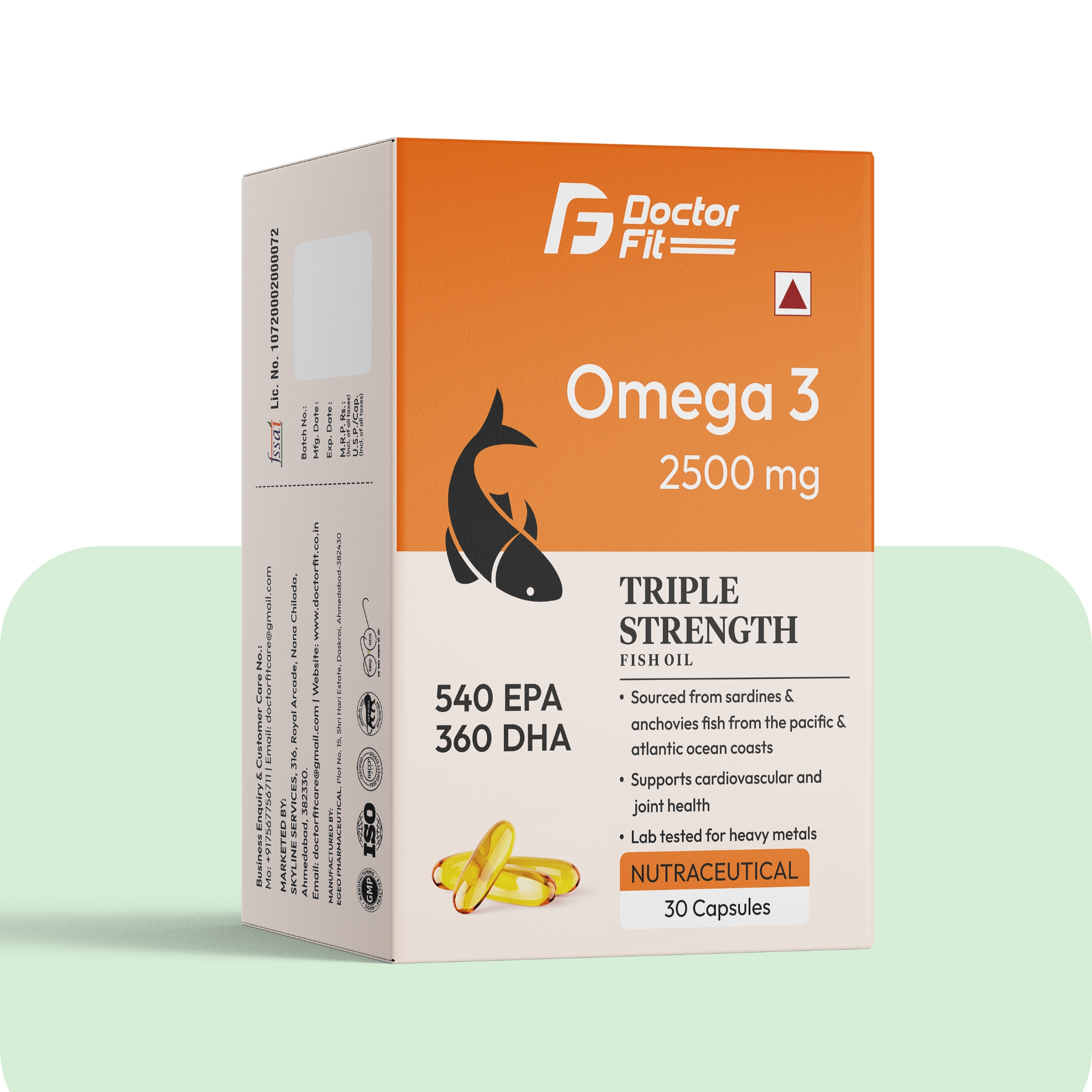 Doctor Fit Omega 3 is a triple-strength fish oil supplement delivering 540 mg EPA and 360 mg DHA per serving. Sourced from premium sardines and anchovies, it supports heart health, brain function, and joint mobility. Lab-tested for purity and free from heavy metals, it provides a clean and powerful boost for overall wellness.