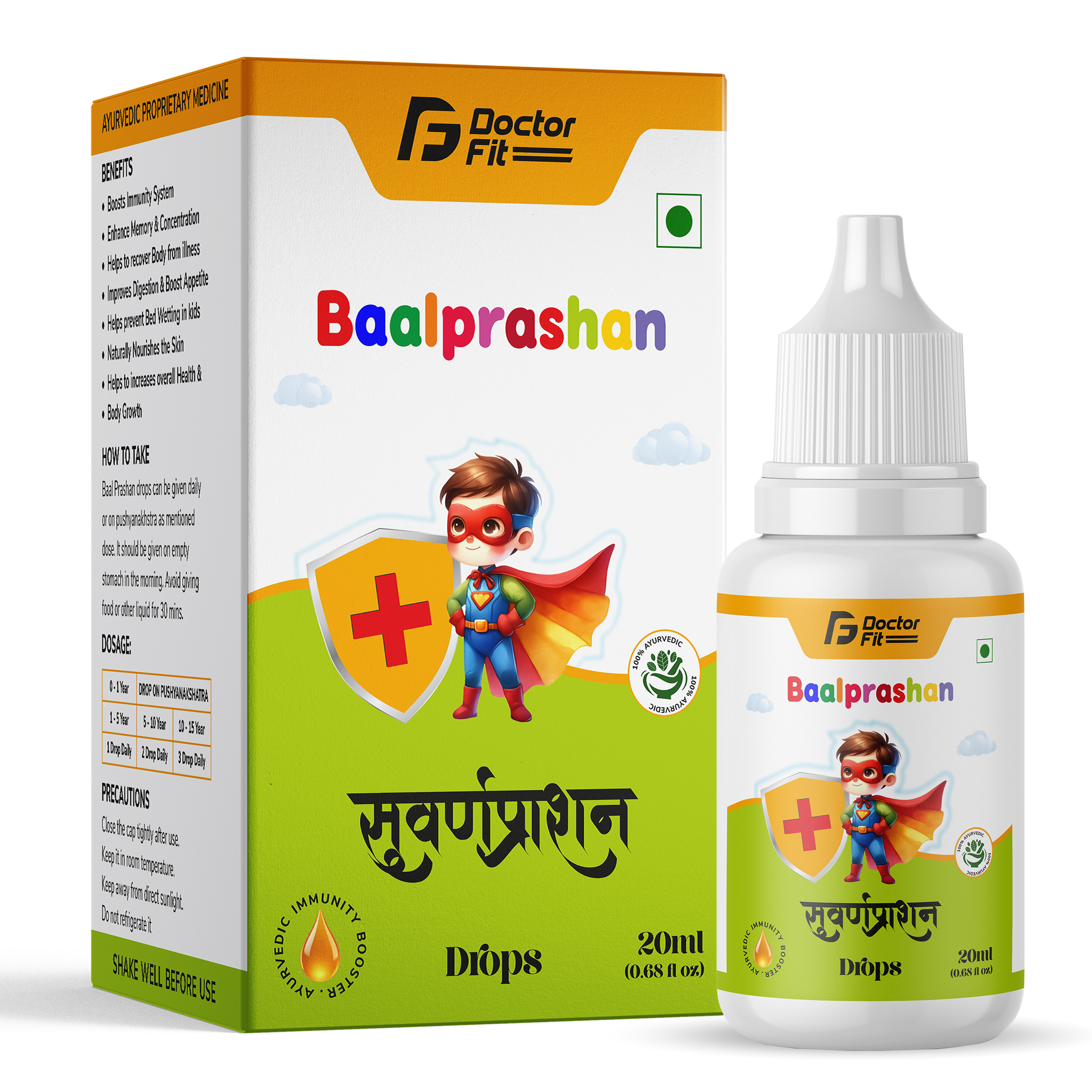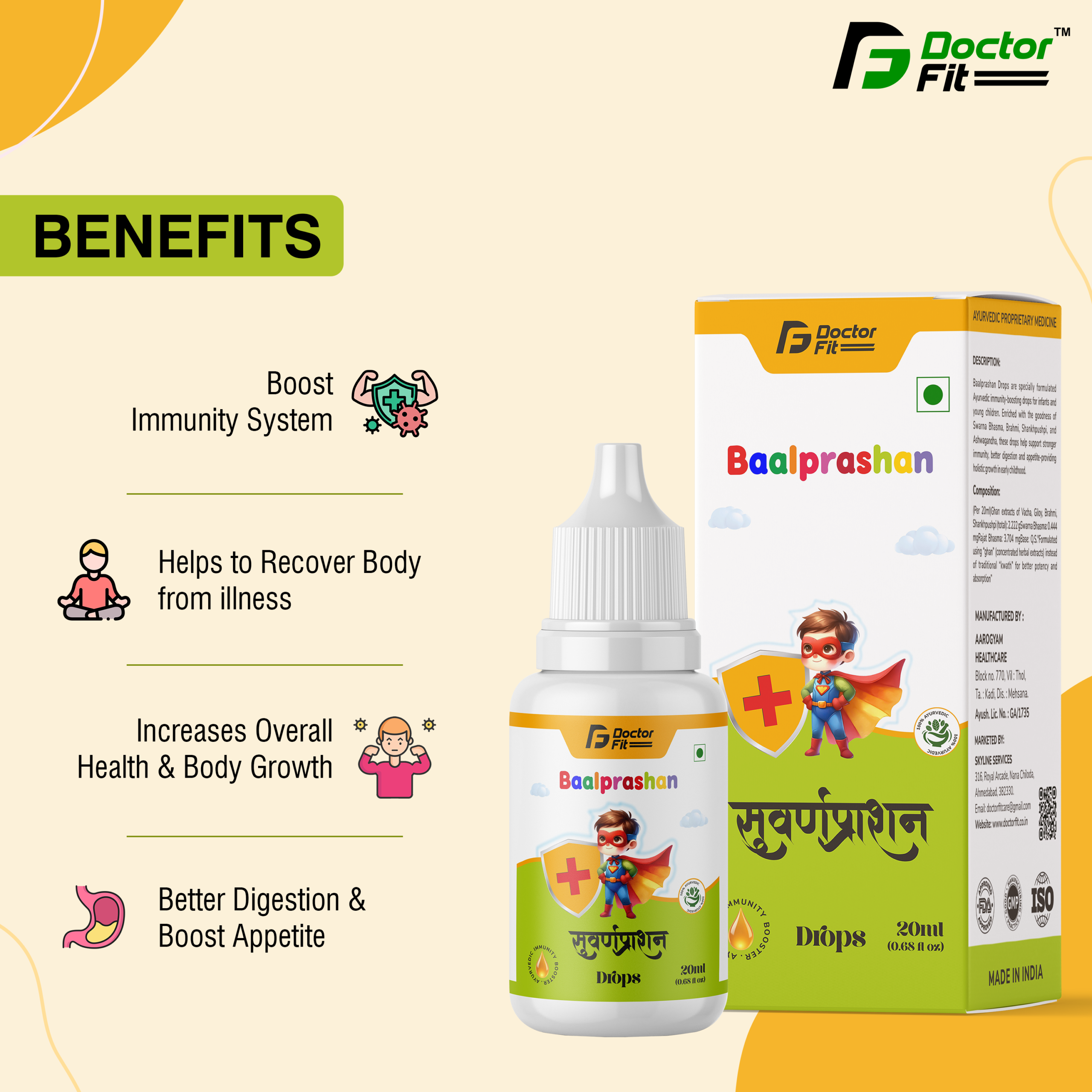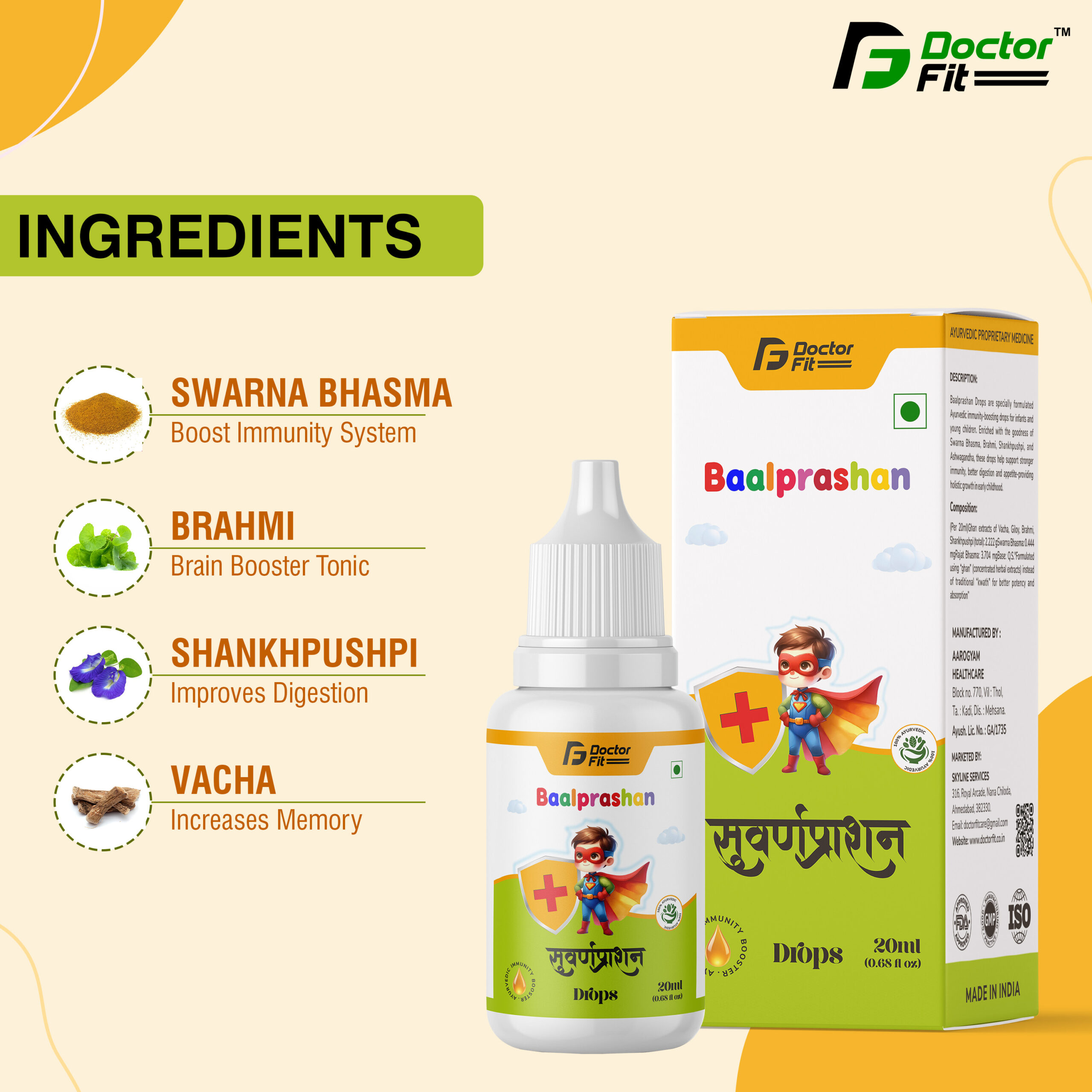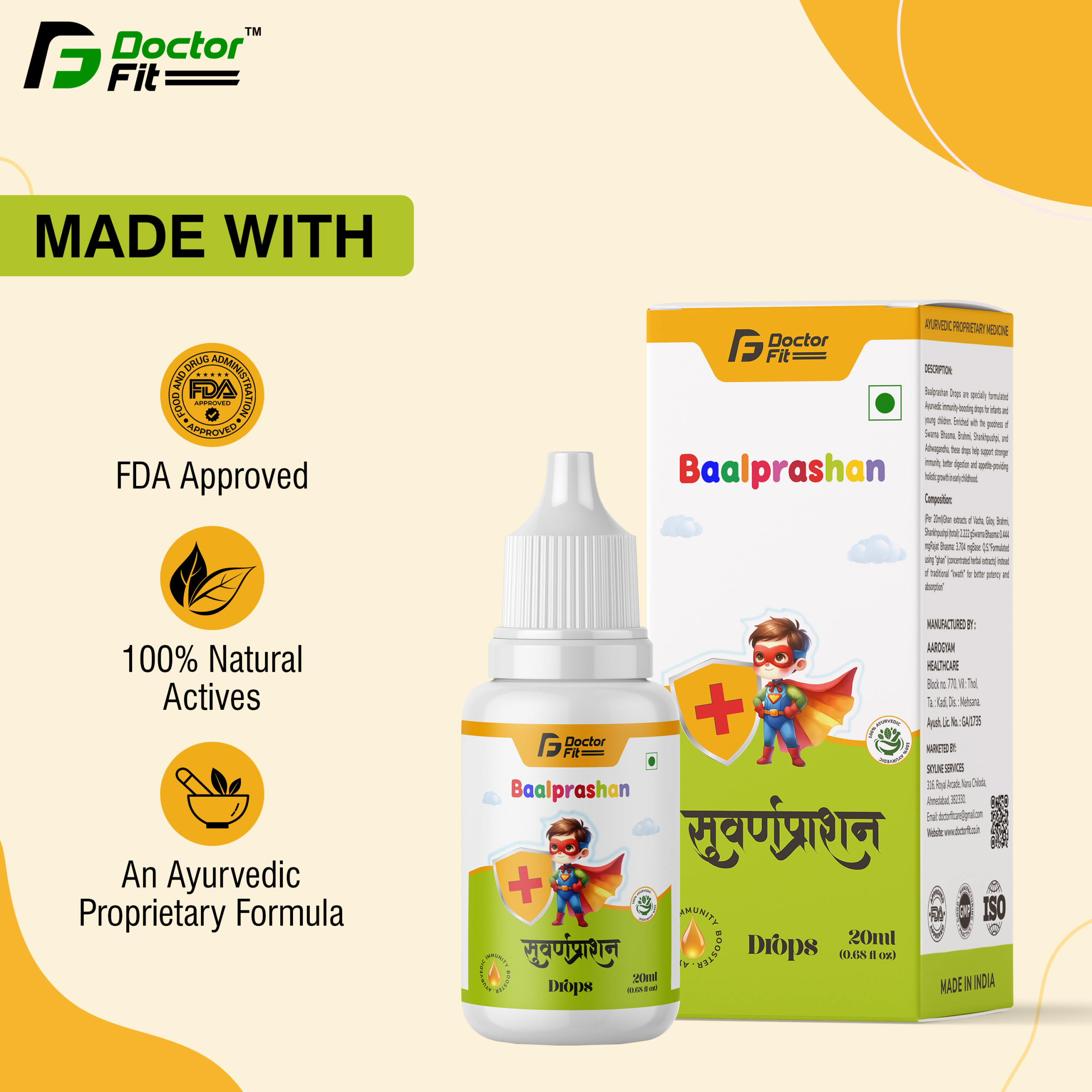 DOCTORFIT Swarnaprashan for Kids – Enriched with 24CT Gold Immunity Booster Drops Healthy Growth & Strength – 100% Ayurvedic – FDCA Approved, Age 0-15 Years (20ml, Pack of 1)