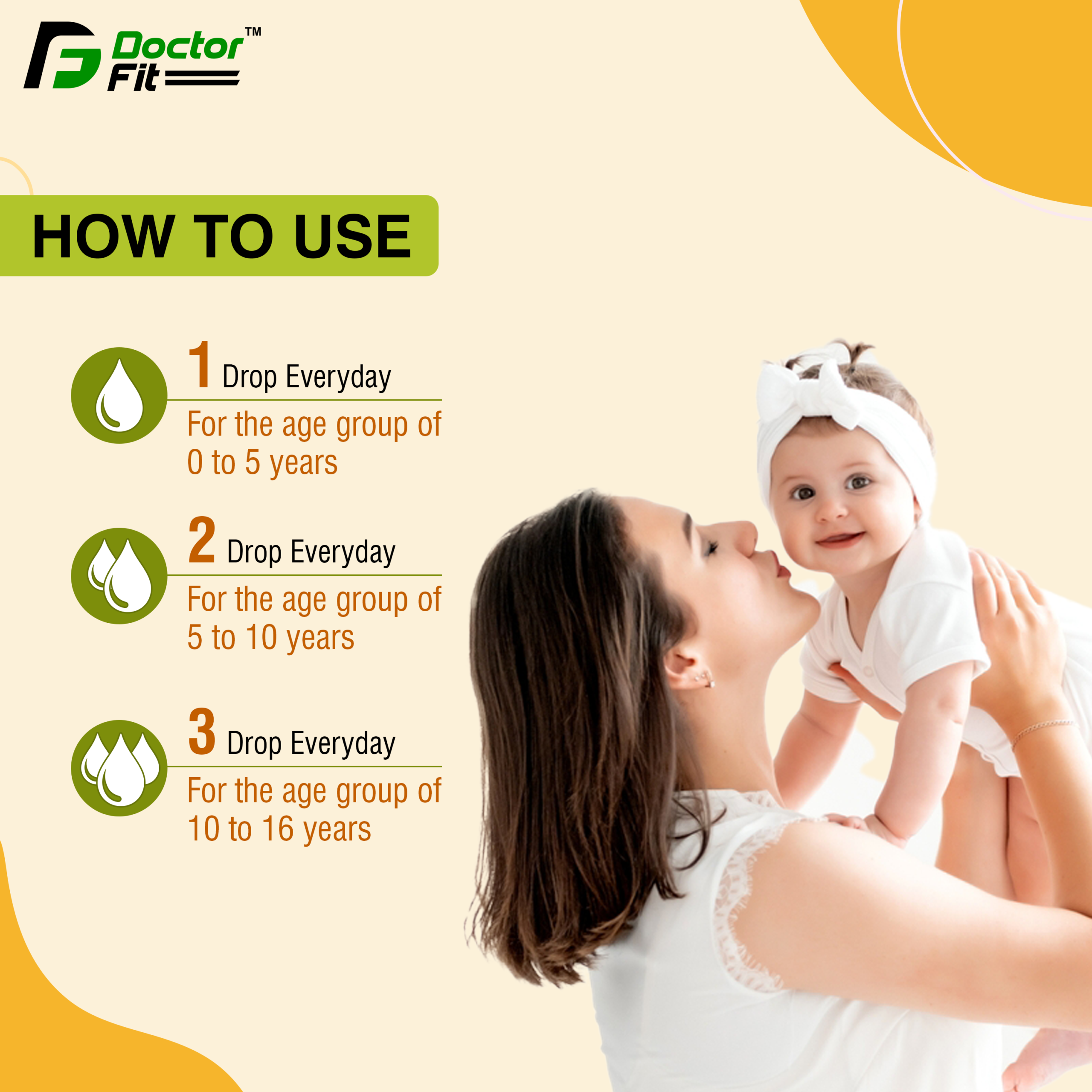 - ✅ Easy to Use – Just 1 drops daily for 0-5 years, 2 drops daily for 5-10 years and 3 drops daily for 10-16 years as per age group (0–16 years).