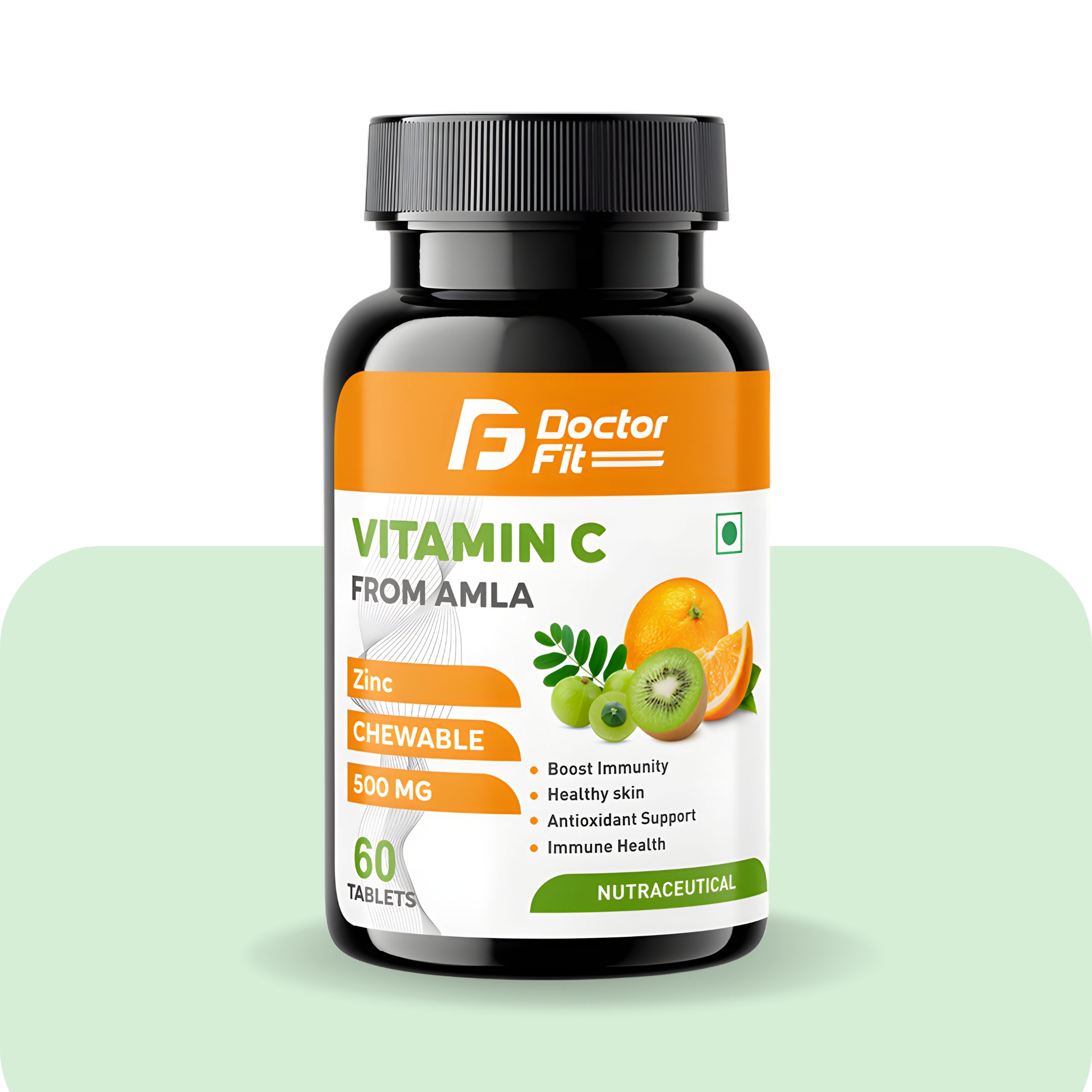 Doctor Fit Vitamin C from Amla with Zinc Chewable Tablets is a high-quality nutraceutical formulated for maximum immune and antioxidant support. Each convenient, great-tasting chewable tablet delivers a potent 500mg dose of Vitamin C, sourced naturally from Amla (Indian Gooseberry), a traditional source known for its incredibly high Vitamin C content and bioavailability.